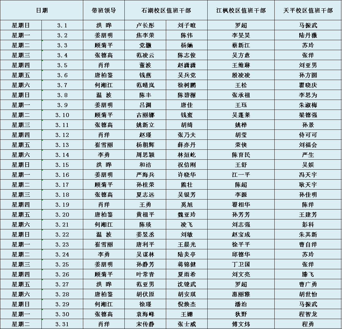 值班管理 当前位置: 部门首页 > 服务指南 > 值班管理 > 正文 苏州科技大学2025-2026学年总值班安排表(2026年3月1日-2026年3月31日) 发布:浏览量:时间:2026-02-27 15:08:23